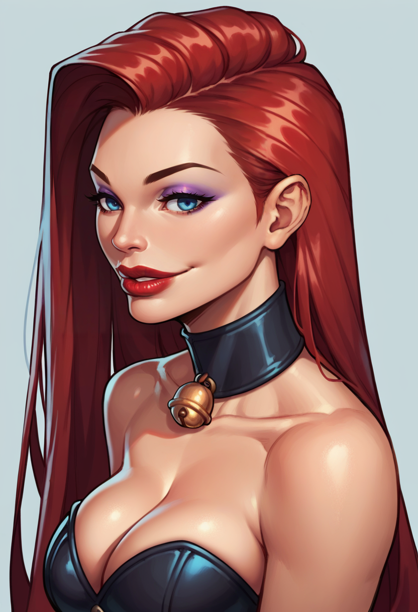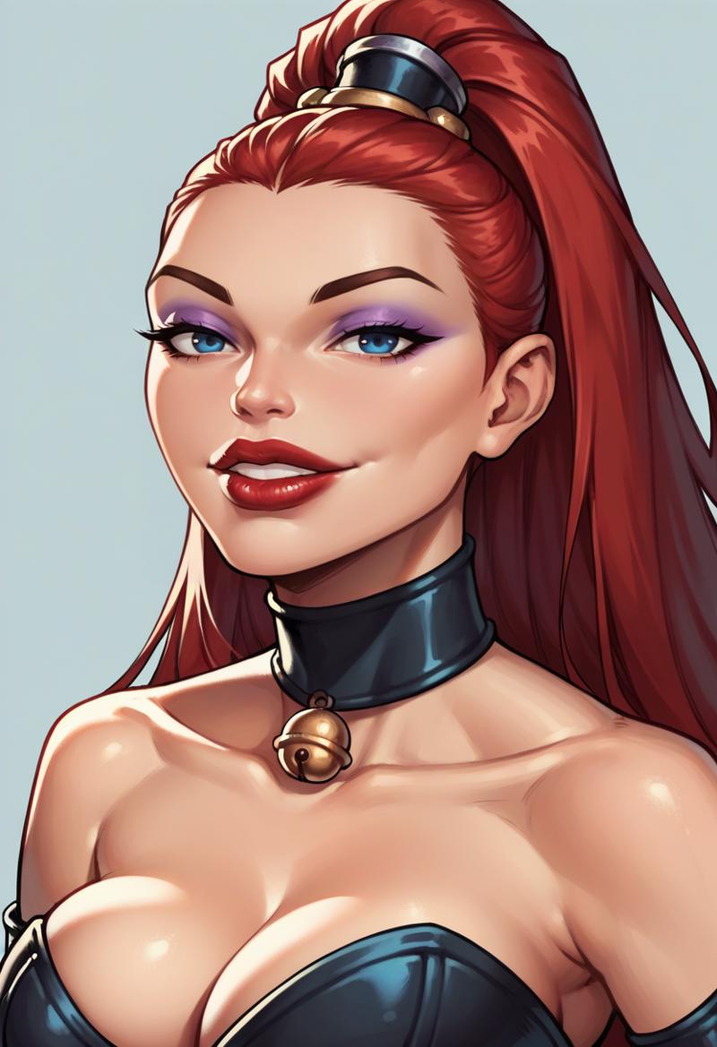 score_9, score_8_up, score_8, source_anime, 1girl, lora:DarkMistress:0.75 蓝眼睛, 大乳房, 嘴唇, 厚唇, 红色口红, 妆容, 紫色眼影, 红发, 裸露肩膀, 微笑, 深沟, 上半身, 带铃铛的黑色项圈, 紧身胸衣, 极长发, 侧视图,