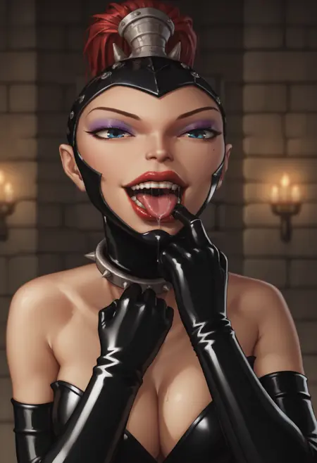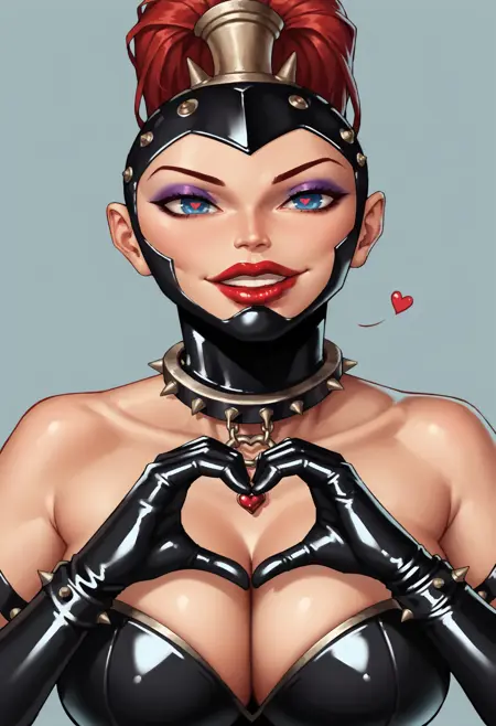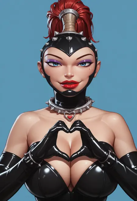 score_9, score_8_up, score_8, source_anime, 1girl, lora:DarkMistress:0.85 蓝眼睛, 大乳房, 嘴唇, 厚唇, 红色口红, 妆容, 紫色眼影, 红发, 裸露肩膀, 笑容, 张嘴, 头盔, 手套, 乳胶面具, 带钉项圈, 乳胶连体衣, 项圈, 深沟, V字手势,
