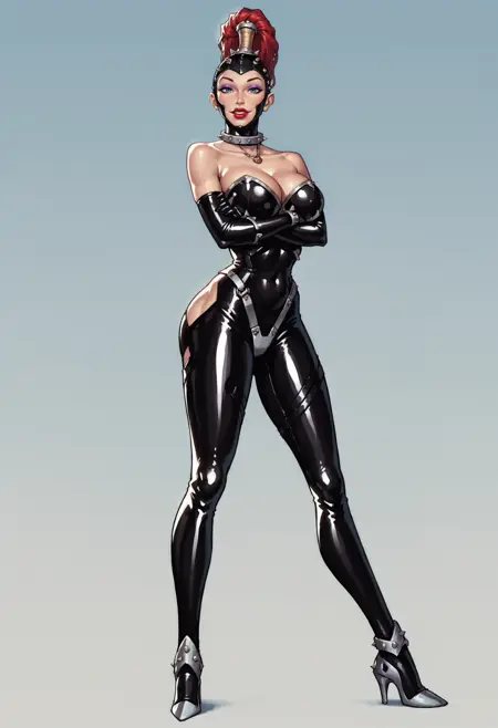 score_9, score_8_up, score_7_up, score_6_up, score_5_up, score_4_up, 1girl, lora:DarkMistress:0.75 蓝眼睛, 大乳房, 深沟, 手套, 乳胶面具, 带钉项圈, 嘴唇, 厚唇, 红色口红, 妆容, 紫色眼影, 头盔, 红发, 乳胶连体衣, 项圈, 裸露肩膀, 仰视视角, 愤怒, 高跟鞋, 腿抬起, 脚, 站立,