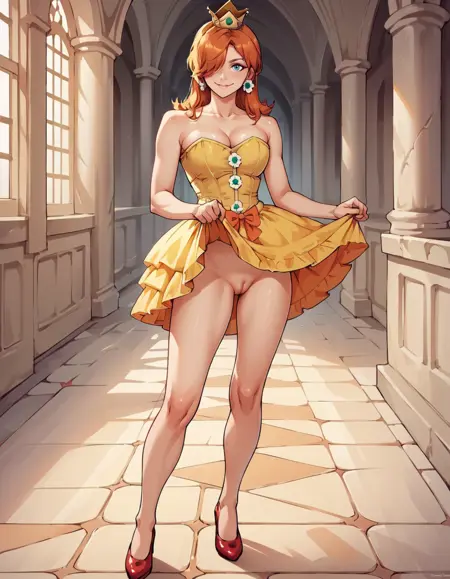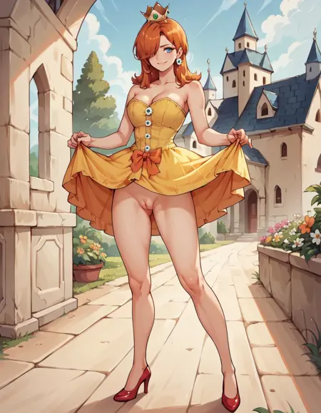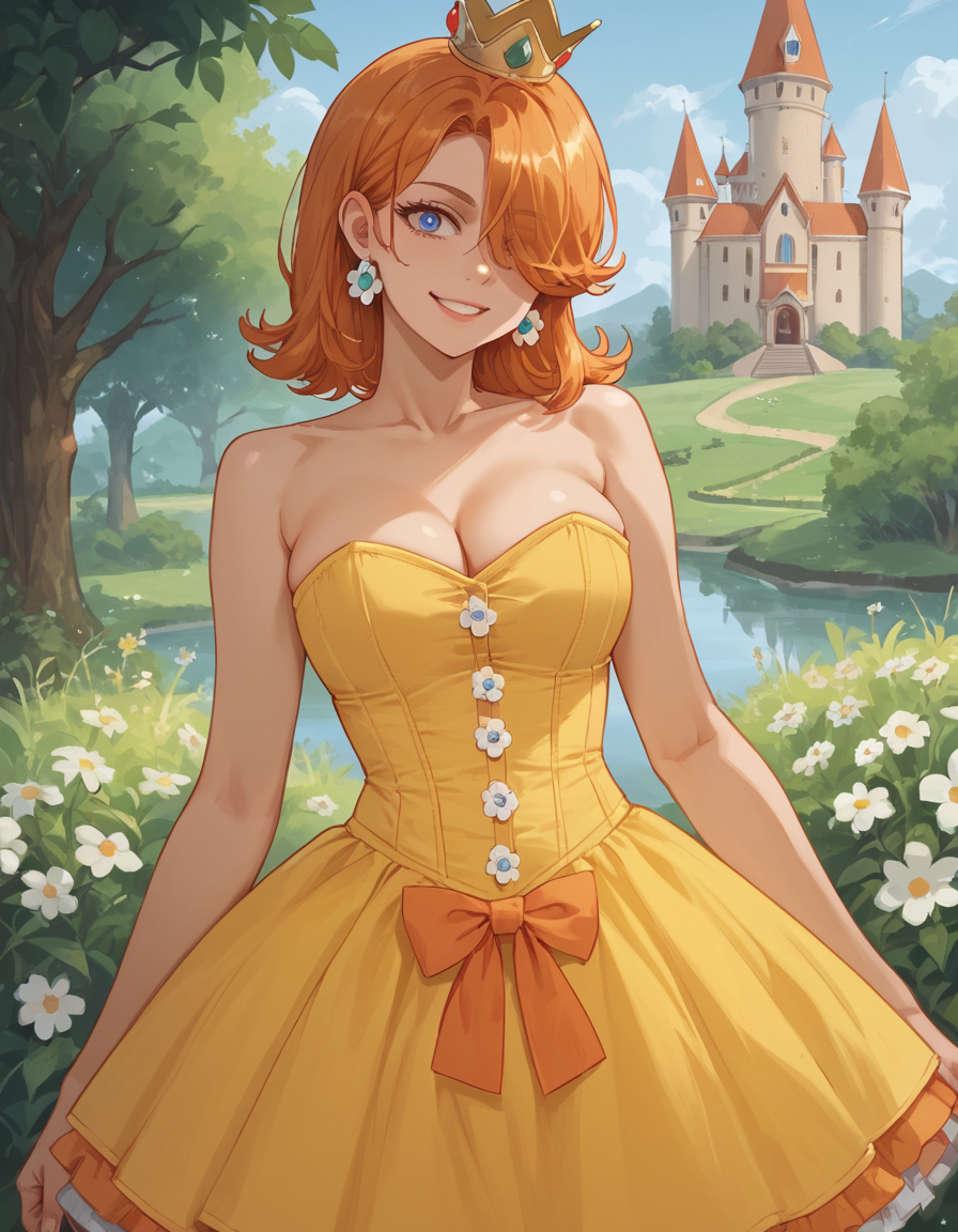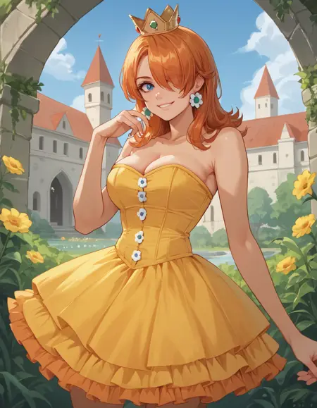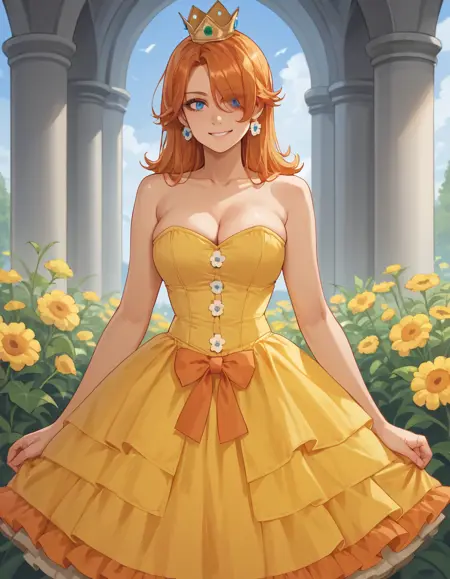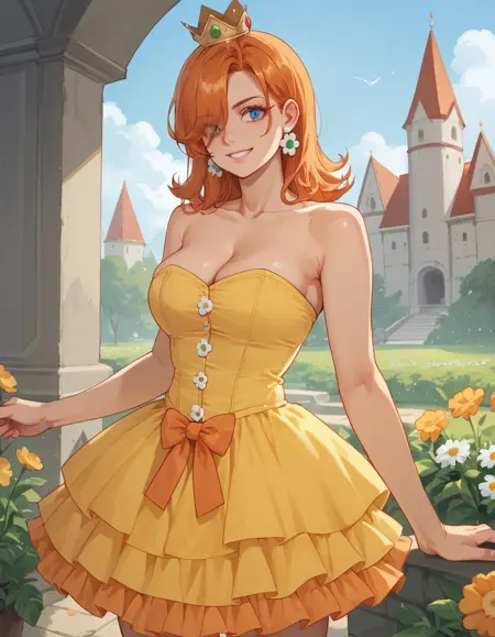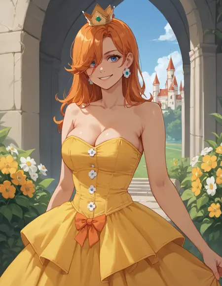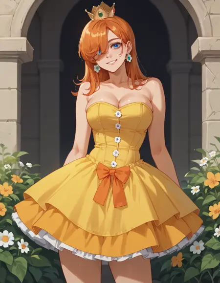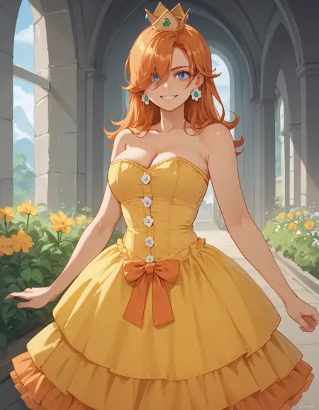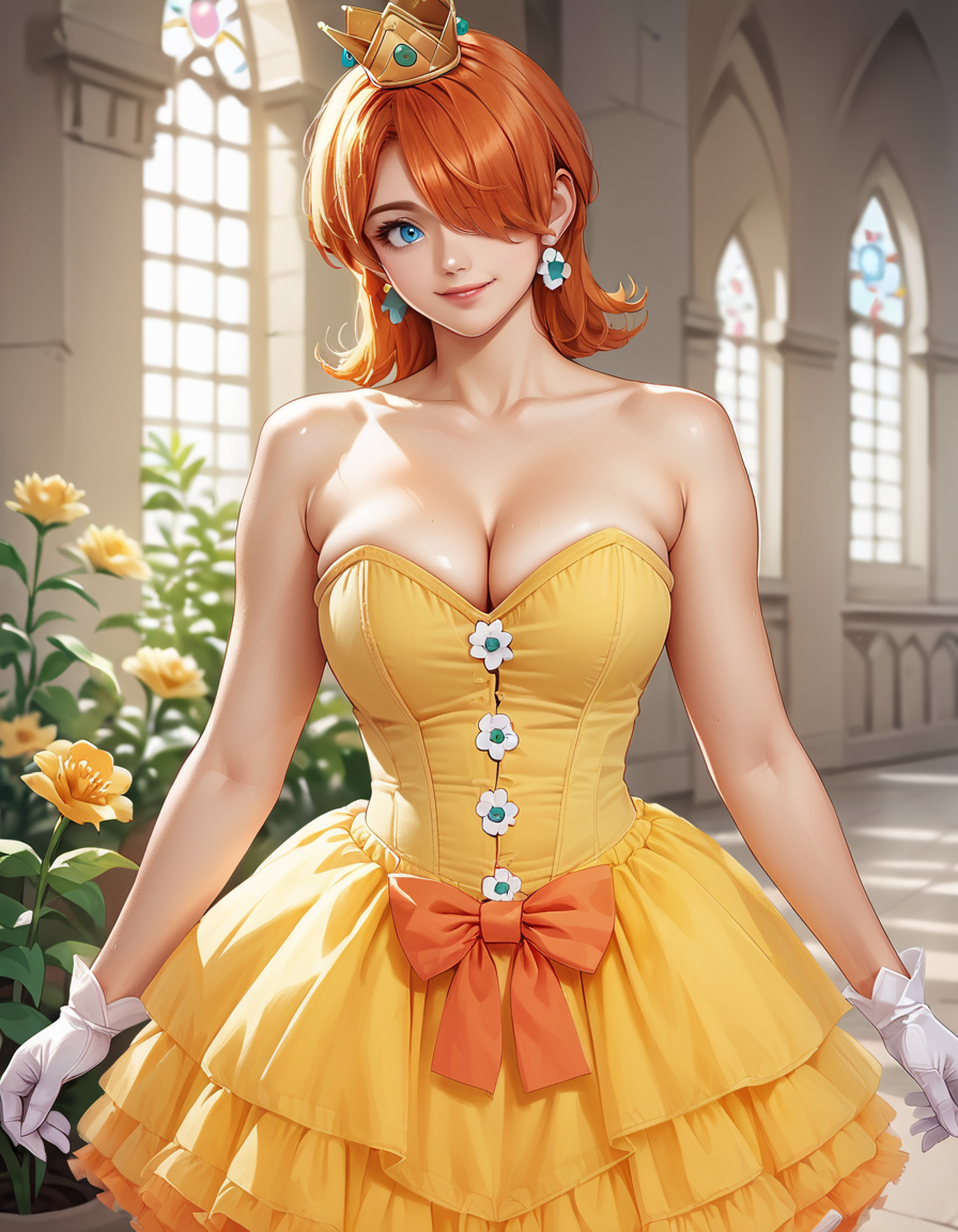 Daisy用: 1girl, solo, 片方の目を覆う髪, オレンジ色の髪, hud_crst_prncss_drss, 黄色のショートドレス, コルセット, 花ボタン, 肩出し, オレンジ色のフリル, クラウン, デイジーのイヤリング, 白い手袋