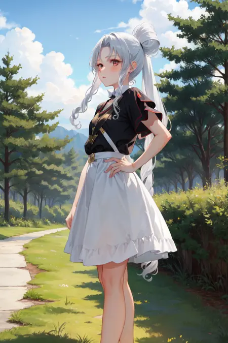 她的 服装 并非百分之百准确,但你可以尝试下列提示词: