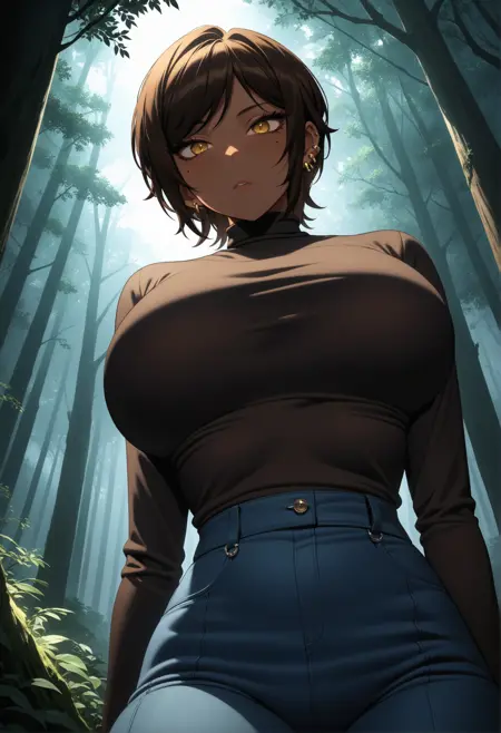 茶色の髪、黒髪、黄色い目、短髪、前髪、ジュエリー、イヤリング、ピアス、耳のピアス、目の下のほくろ、濃い肌、濃い肌の女性