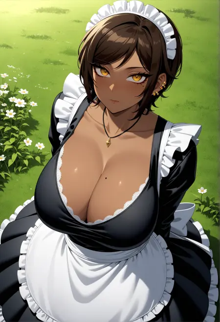 갈색 머리, 검은 머리, 노란 눈, 단발, 앞머리, 보석, 귀걸이, 피어싱, 귀 피어싱, 눈 밑 두더지, 검은 피부, 검은 피부의 여성