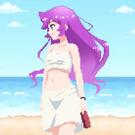 비치 복장: 로민, 비치 복장, 분홍색 비키니, 흰색 타월 착용. 때로는 타월을 꼭 잡으려 하므로, 손에 뭔가 할 일을 지시하여 이런 상황이 일어나지 않도록 하세요.