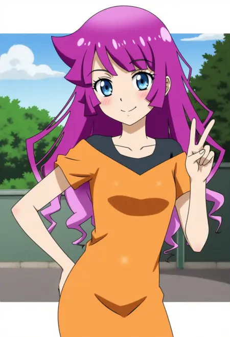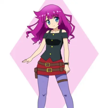 보라색 머리카락을 가진 로민의 애니메이션 스타일 그림, 듀얼 복장 착용: 검정 상의에 노란 버튼, 빨간 치마에 벨트 두 개, 보라색 바지, 전체 몸 그림