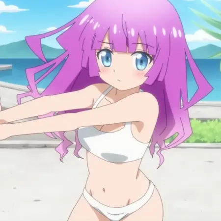보라색 머리카락을 가진 로민의 애니메이션 스타일 그림, 흰색 비키니 착용, 밖에서 스트레칭하는 모습