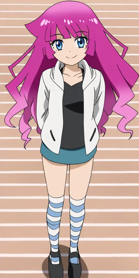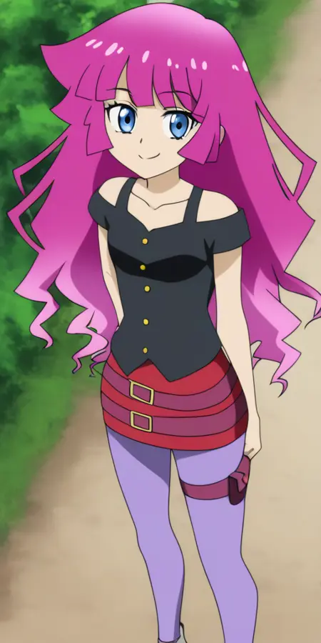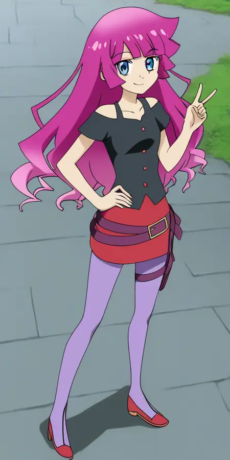 보라색 머리카락을 가진 로민의 애니메이션 스타일 그림, 듀얼 복장 착용: 검정 상의에 노란 버튼, 빨간 치마에 벨트 두 개, 보라색 바지, 전체 몸 그림