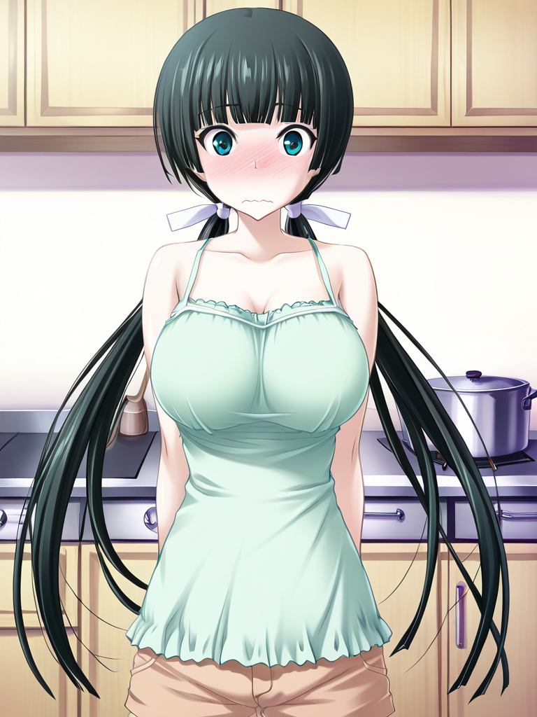 유키에: 마유즈미 유키에, 검은 머리, 곧은 앞머리, 긴 머리, 낮은 트윈테일, 파란 눈,