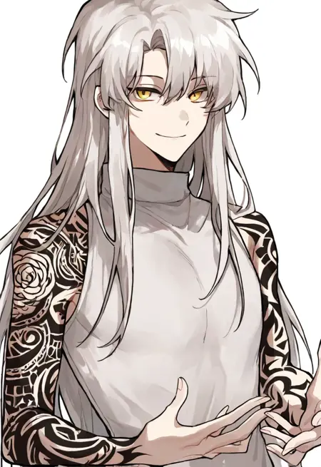 AyinAdam,手臂纹身,黄眼睛,白发,长发,白长袍,灰裤子,赤脚