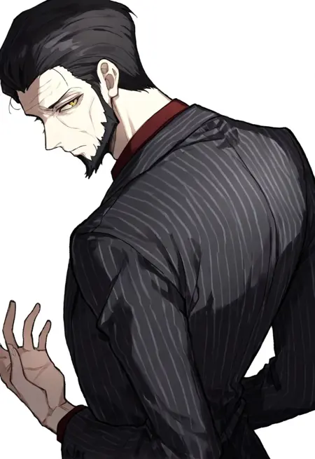 AyinAbel,黄眼睛,黑发,短发,背梳发型,胡须,络腮胡,红衬衫,黑领带,灰外套,灰裤子,条纹,棕色鞋子,手杖