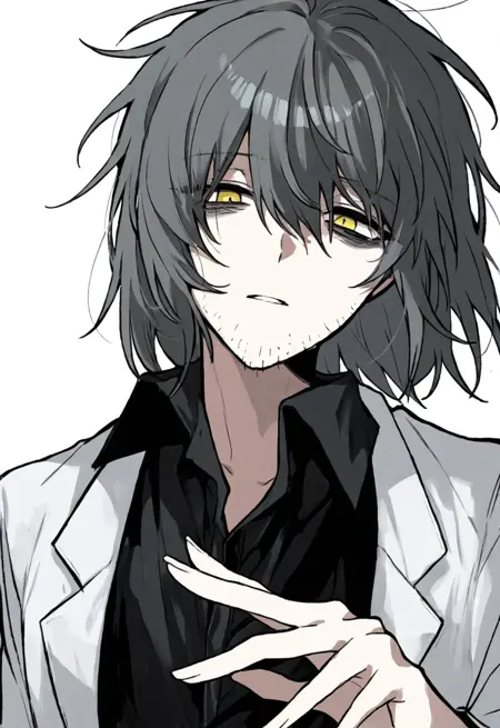 AyinAbram,黄眼睛,灰发,中长发,凌乱发型,胡须,短须,眼下有眼袋,黑衬衫,黑裤子,灰袜,黑拖鞋,白大褂
