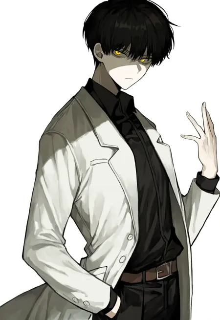 AyinNormal,黄眼睛,黑发,短发,黑衬衫,黑裤子,棕色腰带,棕色鞋子,白大褂