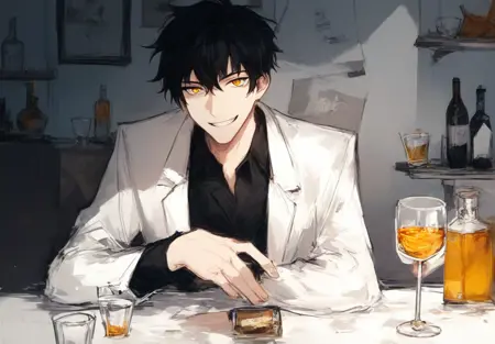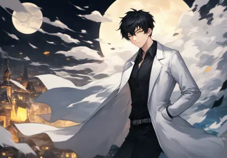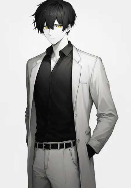 AyinNormal,黄眼睛,黑发,短发,黑衬衫,黑裤子,棕色腰带,棕色鞋子,白大褂