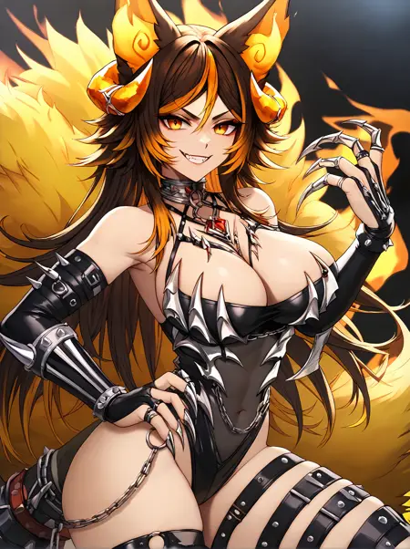 角、爪、黒色ハルターネックレオタード、透け感、クラウブラ、金属製首輪、黒色ブライダルガントレット、黒色ハイソックス、Oリング太ももストラップ、ファーのスカーフ