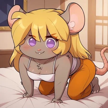 触发词:必须始终包含 "Tootsie, 紫色眼睛, 动物耳朵, 鼠娘, 鼠尾, 灰色毛发, 金色头发"。