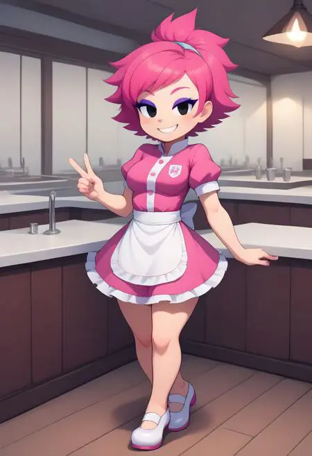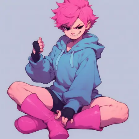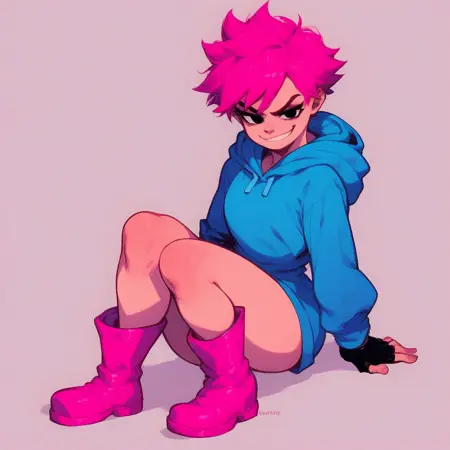 pink hair, black eyes, blue hoodie, short hair, tomboy, pink boots, spats, fingerless gloves, thighs,