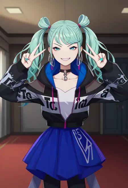 デフォルトの服装: ブラックジャケット、フード付きジャケット、服に文字入り、一部ズボンが開いている、フードを下ろした状態、長袖、白シャツ、青スカート、黒パンスト、リングイヤリング、ブラックチョーカー、ネイルポリッシュ、アクアカラーのネイル、鎖骨