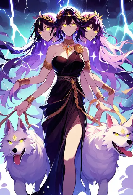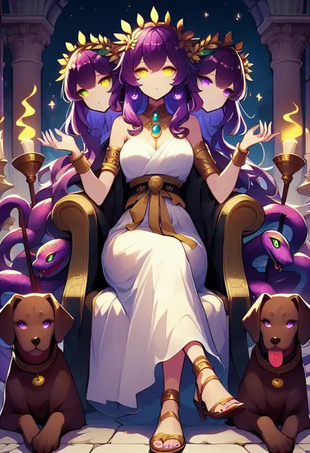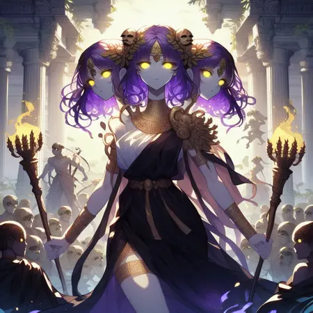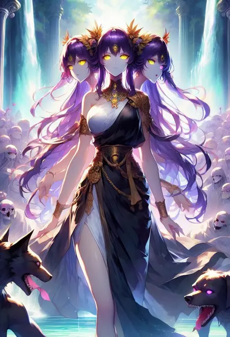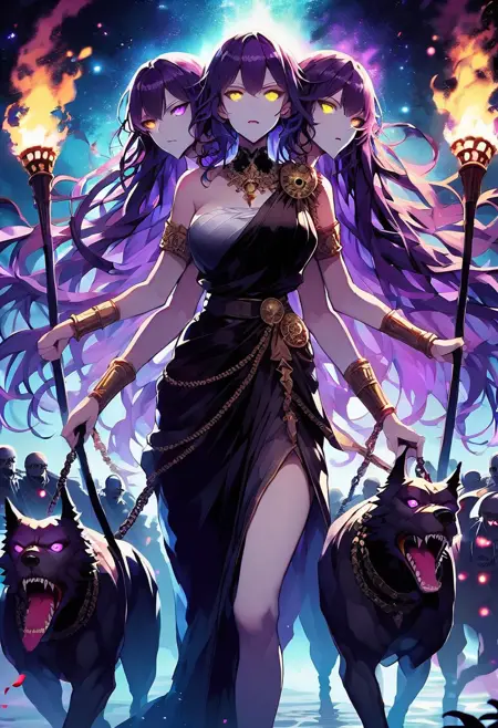 this model is created in the image of Hecate, the Greek Goddess of Crossroads, Witchcraft, the Underworld, and Creatures of the Night in her three-headed form. It is a fun depiction of her likeness that can result in some unique images. 0.4-.9 strength is recommended.