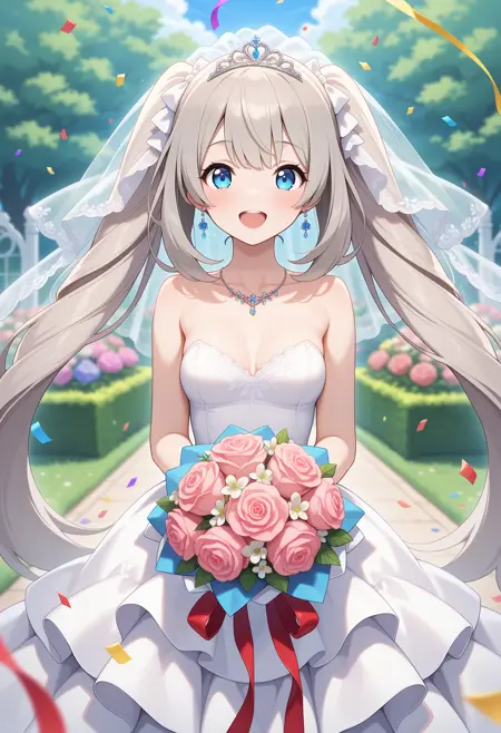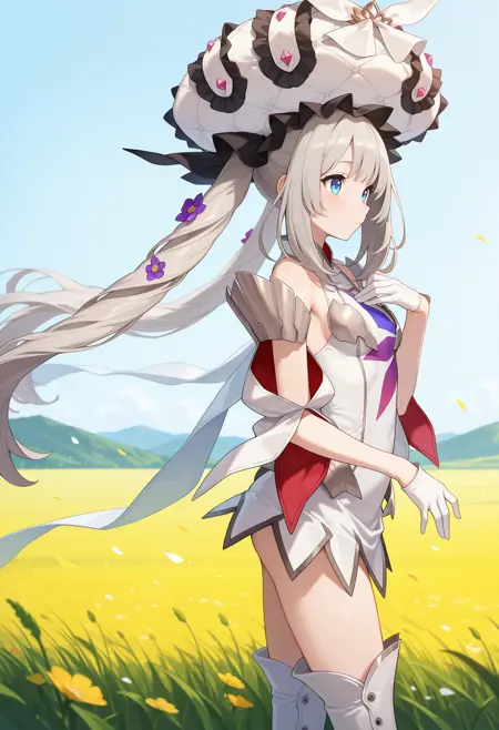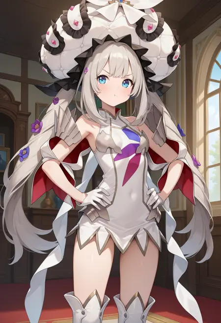 outfit2aamarie, long hair, grey hair, twintails, hair flower, large hat, white headwear, blue eyes, small breasts, shoulder armor, short dress, white dress, armor, sleeveless, detached sleeves, white gloves, thigh boots