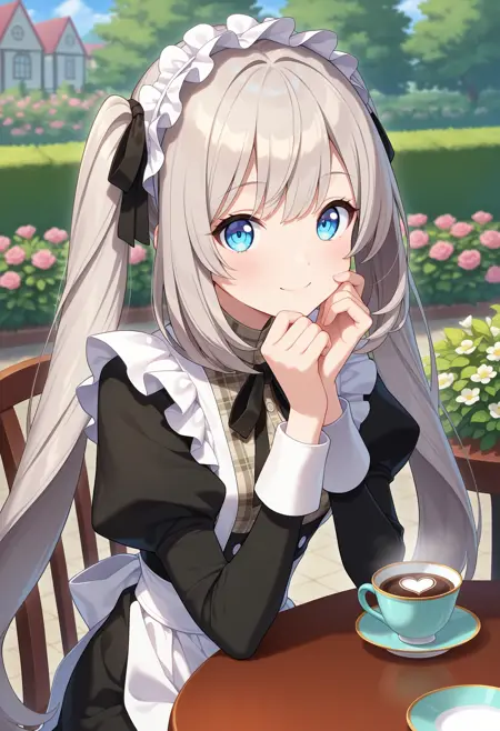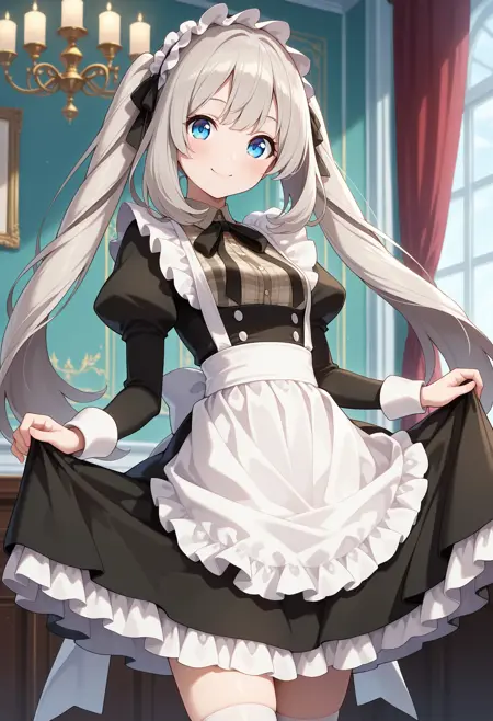 outfit3aamarie, long hair, grey hair, twintails, hair ribbon, black ribbon, maid headdress, blue eyes, small breasts, maid, frills, plaid shirt, black dress, puffy sleeves, long sleeves, white apron