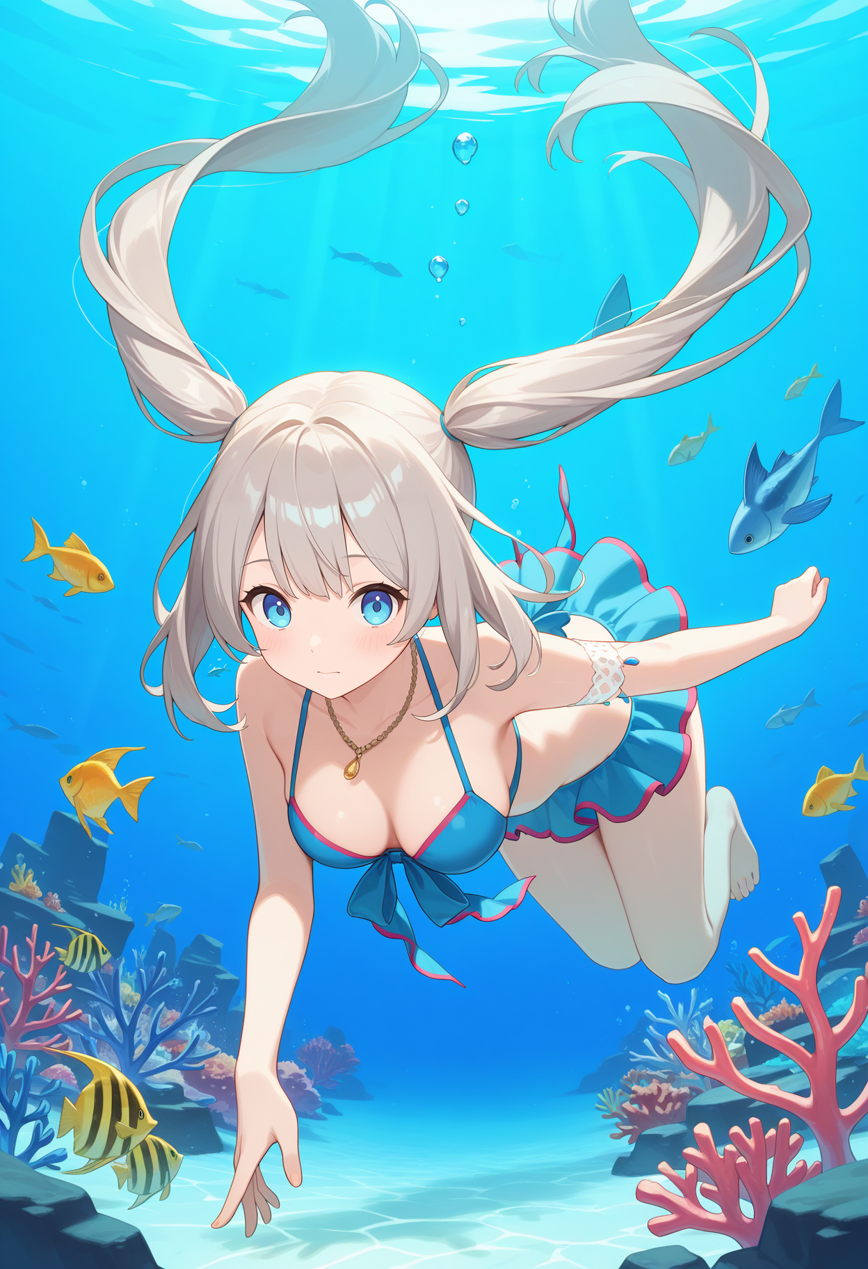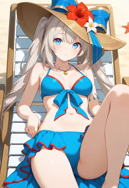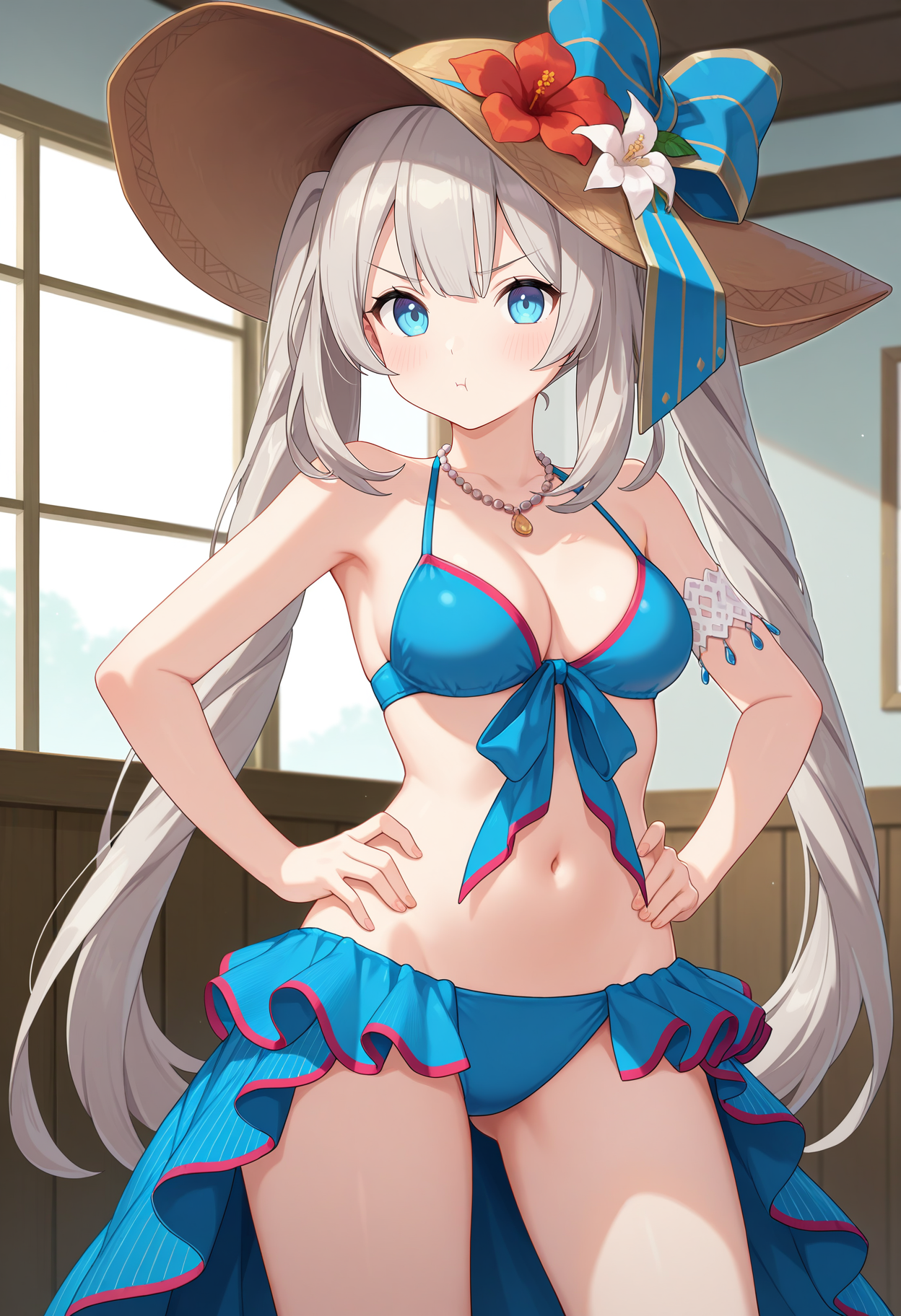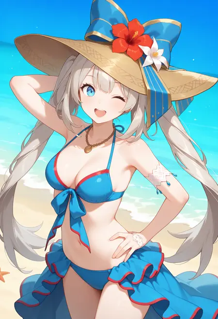 outfit3aamarie, long hair, grey hair, twintails, sun hat, brown headwear, hat flower, hat bow, blue eyes, medium breasts, necklace, blue bikini, armlet, bikini skirt, blue skirt