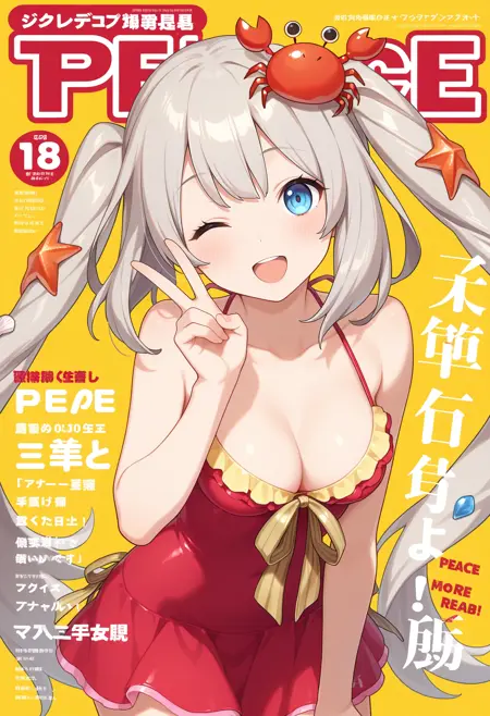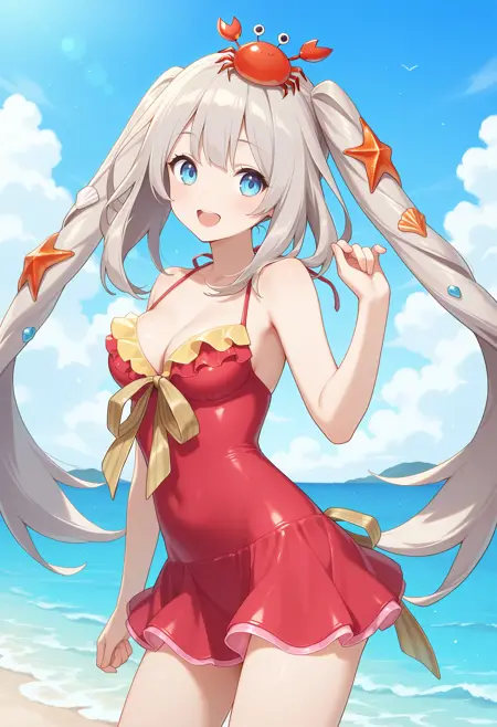 outfit1aamarie, long hair, grey hair, twintails, crab on head, hair ornament, blue eyes, medium breasts, bare shoulders, dress swimsuit, red one-piece swimsuit, yellow ribbon