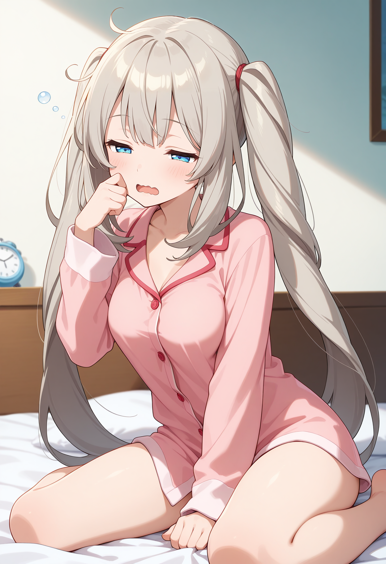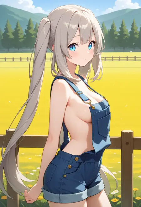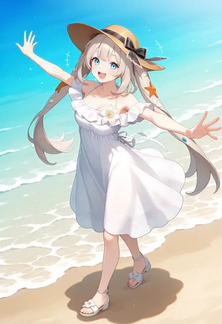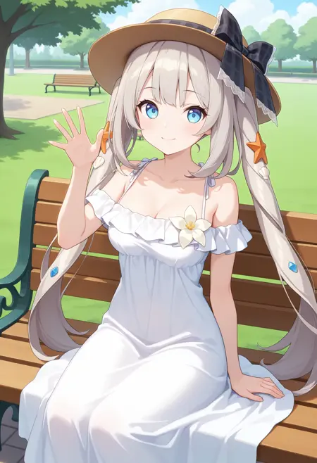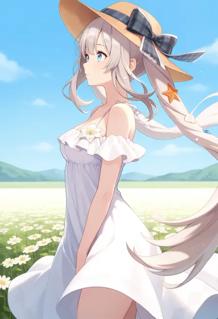 outfit2aamarie, long hair, grey hair, twintails, sun hat, brown headwear, hat bow, hair ornament, blue eyes, medium breasts, sundress, off-shoulder dress, white dress, white flower