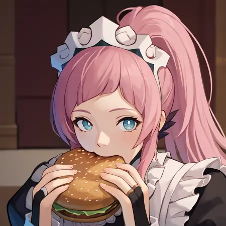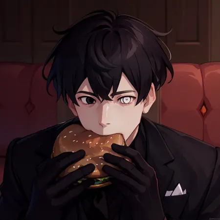 「jermaWhopper, eating, burger, looking at you, upper body」を追加すると、誰かがJerma985を真似るようになります。