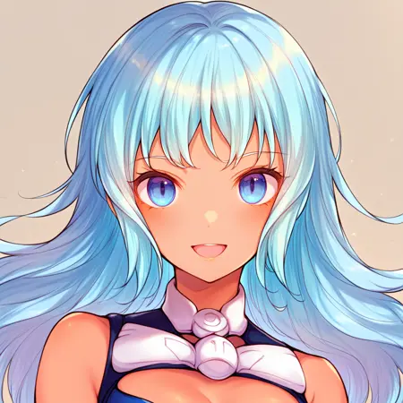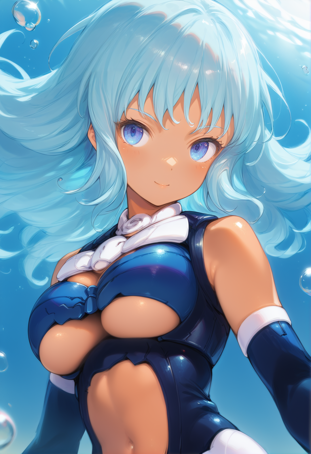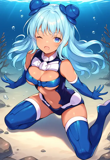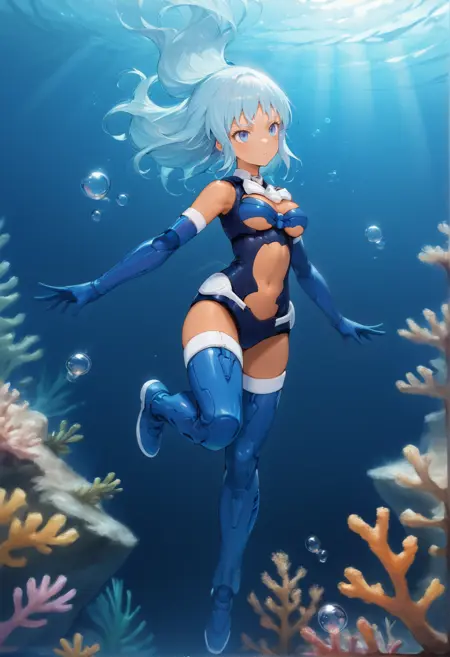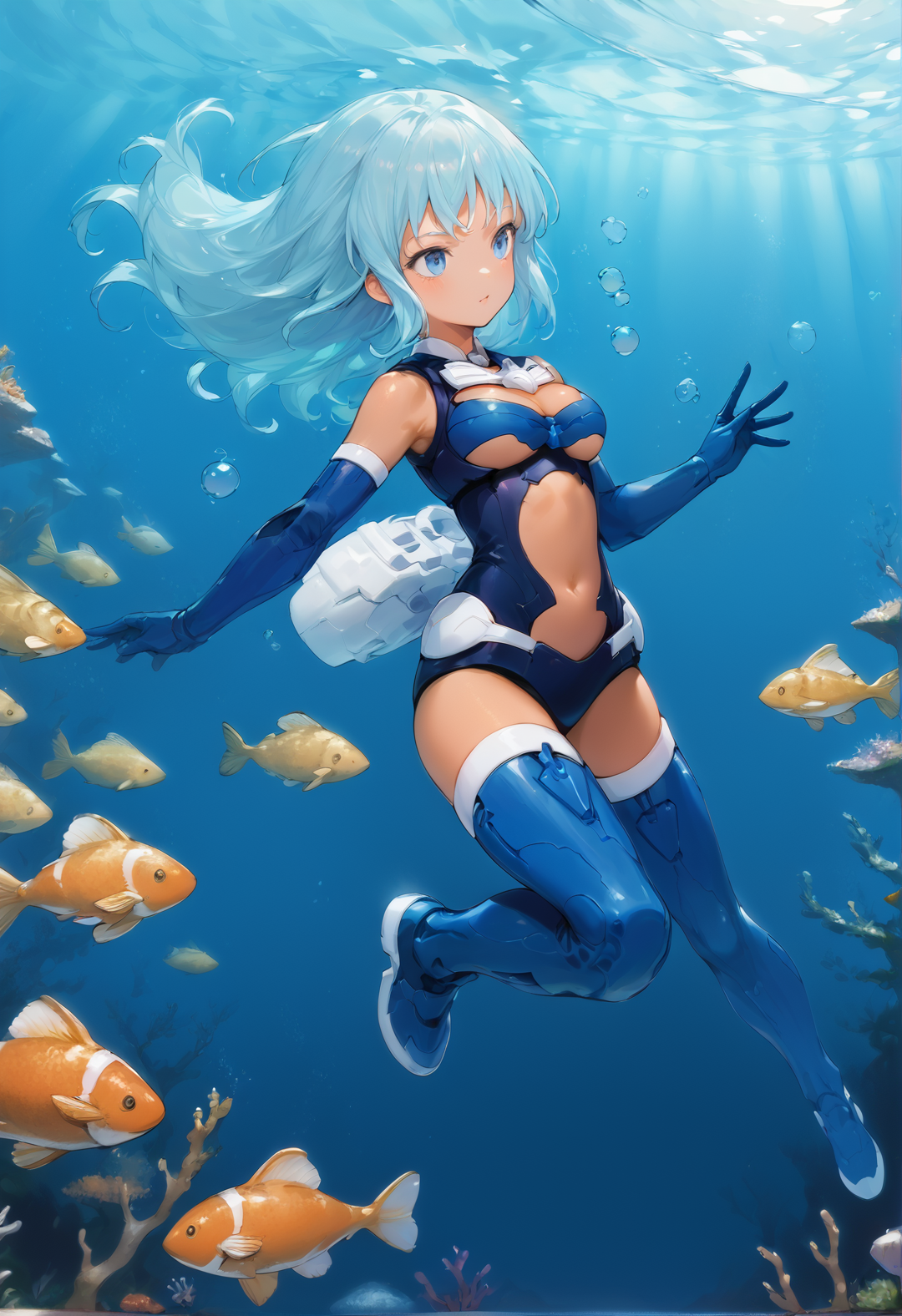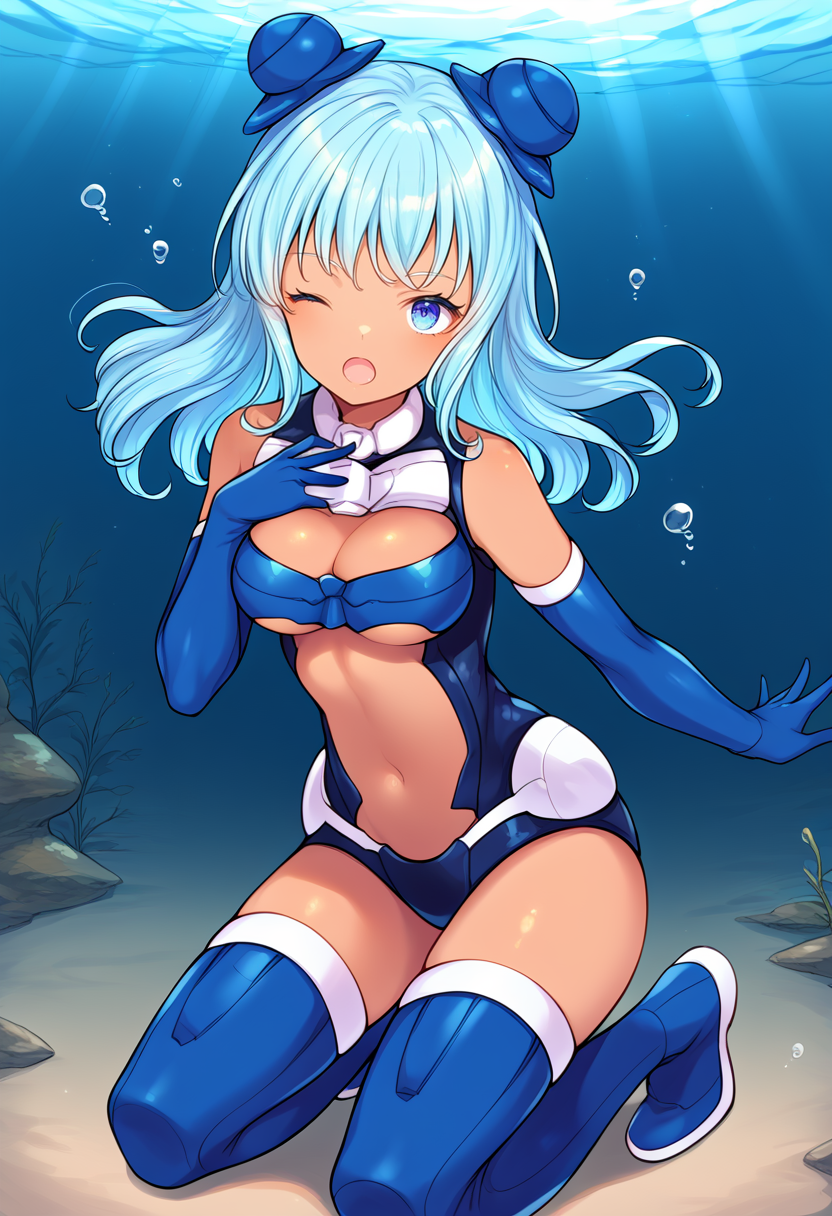 태그(옷): Siana-Amarcia 바디슈트, 파란 바디슈트, 머리 리본, 허벅지 부츠, 팔꿈치 장갑