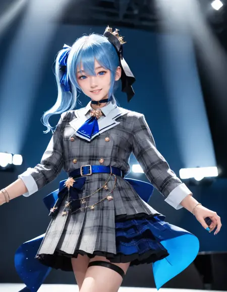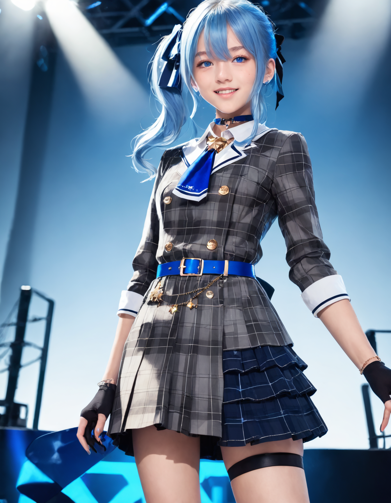 | トレーニングワード | suisei, virtual youtuber, blue hair, blue eyes, side ponytail, blue nails, hair between eyes, jewelry, ribbon,nail polish,medium hair, hair ribbon,long hair,turime,コピーしました! cos 1st, gloves, black gloves, choker, star (symbol),partially fingerless gloves, belt, plaid dress,plaid skirt, skirt, bracelet, shirt, buttons, blue belt,double-breasted, blue ascot, plaid jacket, collared shirt, dress,grey jacket, long sleeves,blue ribbon, blue choker, grey skirt,thigh strap, single thighhigh, socks,コピーしました! |