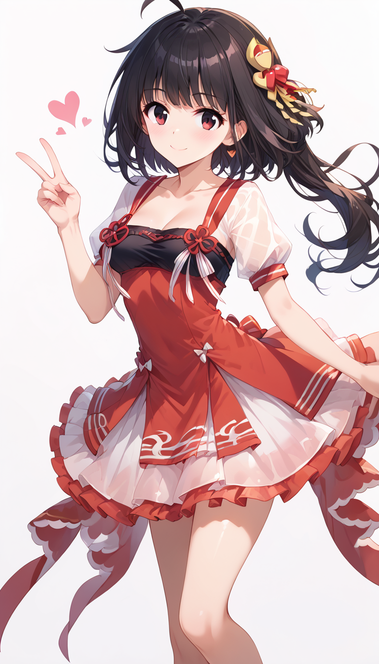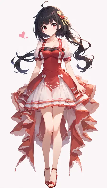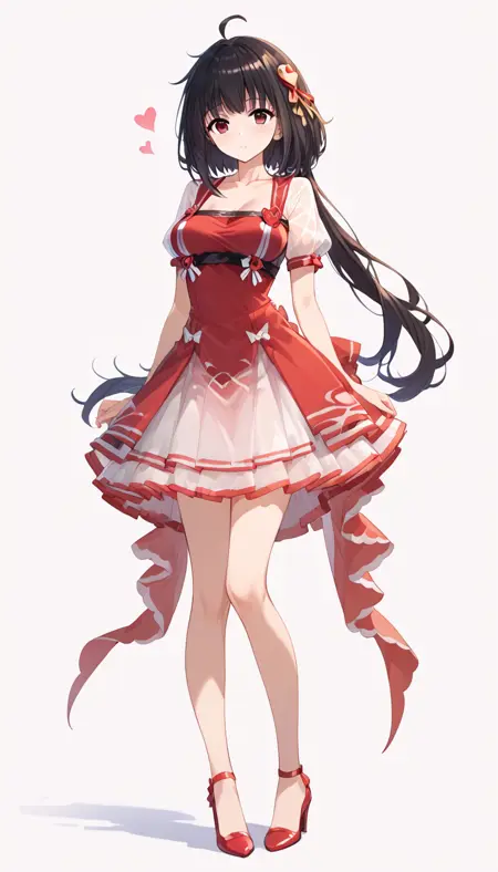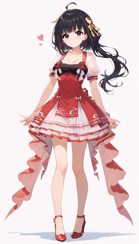 1girl,dress,hair ornament,red dress,bangs,red eyes,black hair,long hair,see-through,short sleeves,collarbone,ahoge,ribbon,high heels,hair ribbon,puffy sleeves,
