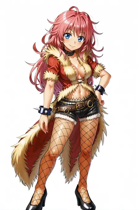 提示词:rogueRO,红色皮毛大衣,交叉系带服装,短袖,露脐,衣领,黑色短裤,带刺手环,手镯,腰带,肚脐,不穿胸衣,渔网袜,黑色高跟鞋,