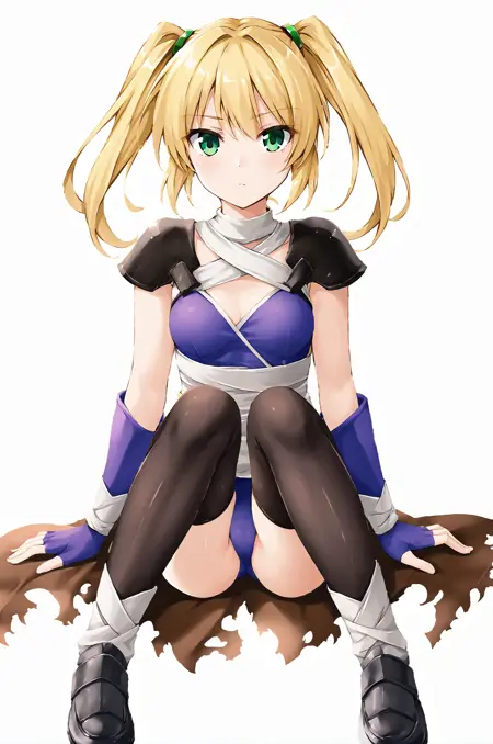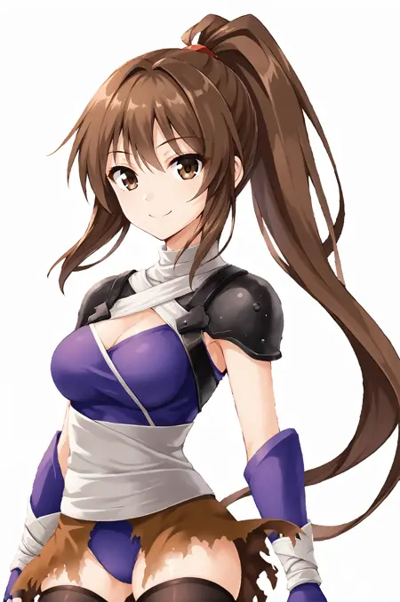prompt: assRO, torn clothes, fingerless gloves, black thighhighs, clothing cutout, cleavage cutout, shoulder armor, purple elbow gloves, purple leotard, bandages, waist cape