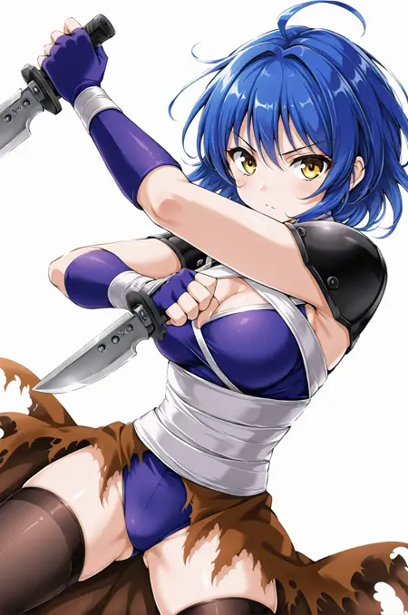 프롬프트: assRO, 헤어진 옷, 손가락 없는 장갑, 검은 허벅지 긴 양말, 옷 자르기, 가슴 자르기, 어깨 갑옷, 보라색 팔꿈치 장갑, 보라색 레오타드, 붕대, 허리 망토