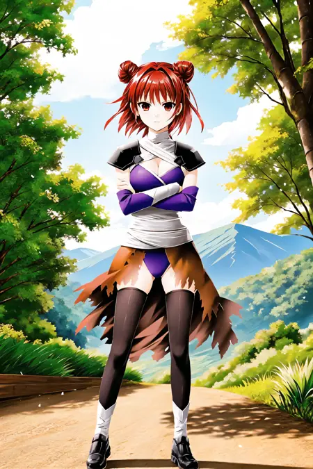 prompt: assRO, torn clothes, fingerless gloves, black thighhighs, clothing cutout, cleavage cutout, shoulder armor, purple elbow gloves, purple leotard, bandages, waist cape