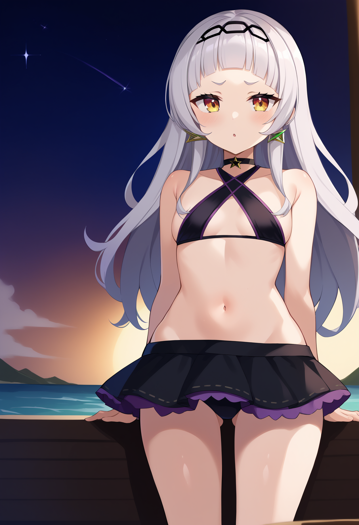 >murasaki shion, murasaki shion \(hololive summer 2019\), hololive, 1girl, long hair, bangs, skirt, navel, bare shoulders, collarbone, swimsuit, yellow eyes, grey hair, sidelocks, bikini, hairband, small breasts, choker, midriff, blunt bangs, black skirt, stomach, black bikini, halterneck, black choker, criss-cross halter, bikini skirt, star choker