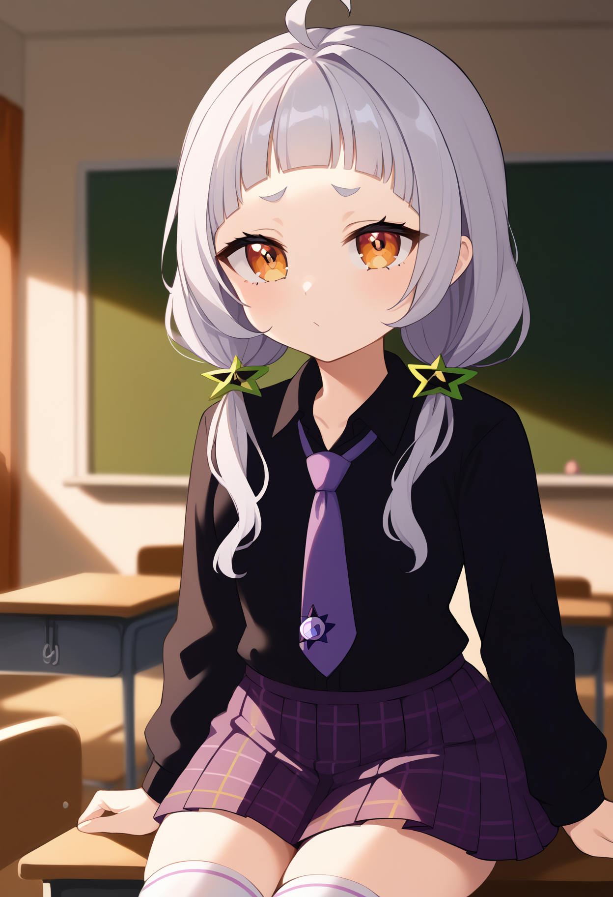 >murasaki shion, murasaki shion \(school uniform\), hololive, 1girl, long hair, skirt, shirt, thighhighs, long sleeves, twintails, ahoge, grey hair, pleated skirt, necktie, collared shirt, blunt bangs, star \(symbol\), purple star print thighhighs, white thighhighs, orange eyes, plaid, black shirt, low twintails, plaid skirt, short eyebrows, purple necktie, loose necktie