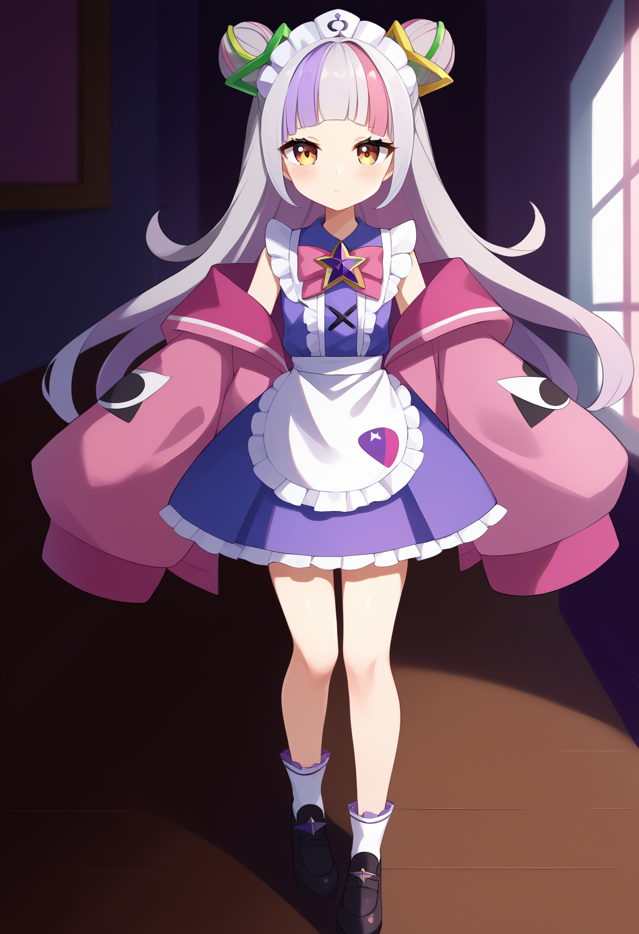 >murasaki shion, murasaki shion \(magical girl maid\), hololive, 1girl, long hair, thighhighs, long sleeves, dress, brown eyes, very long hair, jacket, pink hair, grey hair, multicolored hair, frills, open clothes, shoes, sleeveless, socks, striped, puffy sleeves, off shoulder, hair bun, star \(symbol\), apron, open jacket, streaked hair, sleeves past wrists, maid headdress, double bun, sleeveless dress, frilled dress, pink bow, single thighhigh, waist apron, white apron, purple dress, puffy long sleeves, asymmetrical legwear, frilled apron, pleated dress, pink jacket