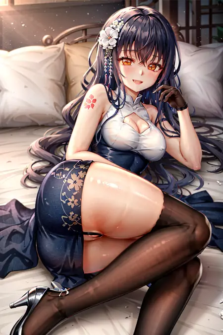 细语春霞(soft_voice_of_spring):azuma (soft voice of spring) (azur lane), china dress, hair flower, half gloves, lace-trimmed legwear, garter straps