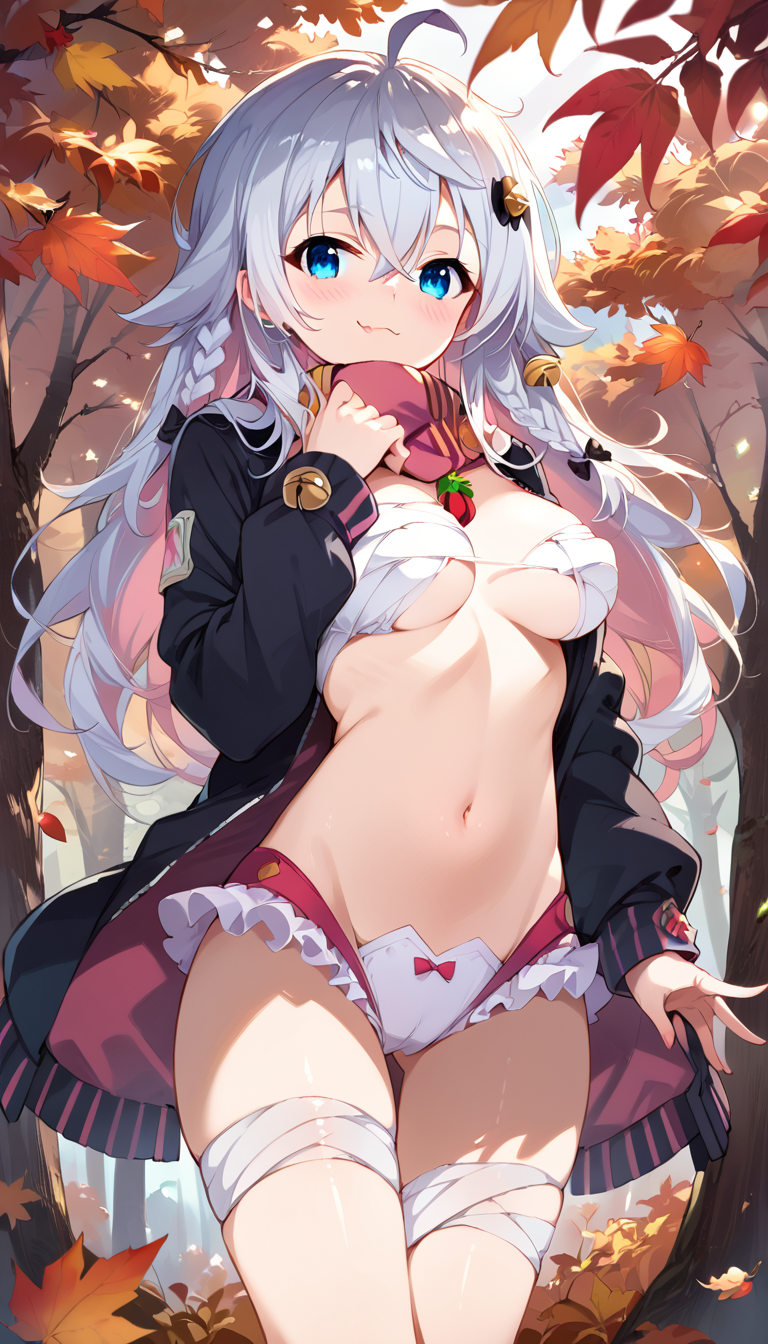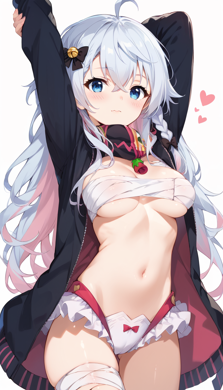 1girl,blue eyes,long hair,white hair,nana_og,ahoge,hair bow,jacket,bow,hair ornament,navel,sarashi,hair between eyes,braid,long sleeves,bell,black jacket,open clothes,bandages,multicolored hair,fang,jingle bell,bangs,scarf,bandaged leg,black bow,