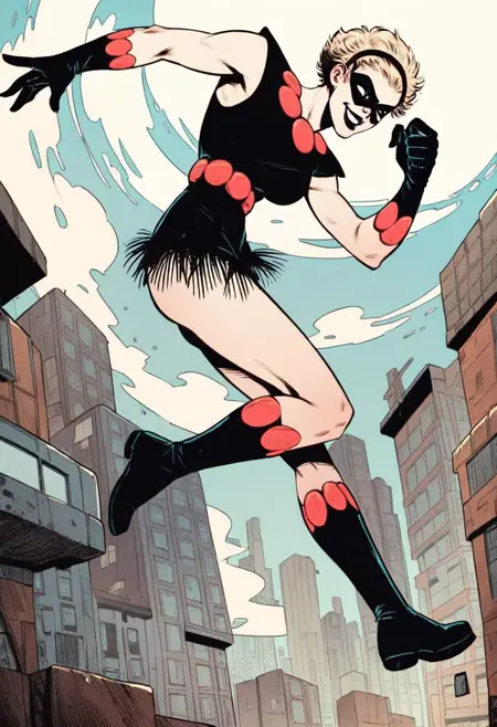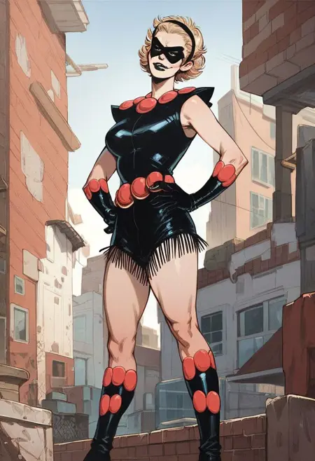 強度:0.9 - 1.0 — スーパーヒーロー衣装は時々正しく、時々大きくずれている。彼女が着ていたのは約3ページ分だけだったので、参考資料が限られていた。