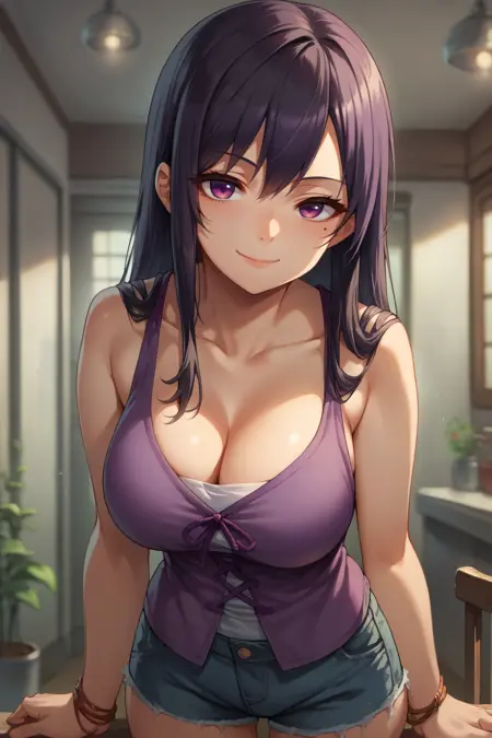 옷차림: 보라색 십자 끈 조끼, 회색 안티, 허리 노출, 소매 없음, 가슴 틈, 청바지 반바지, 팔찌