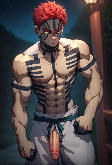 1 boy, male focus, light grey color skin, muscular, red hair, yellow eyes, night, topless male, short hair,