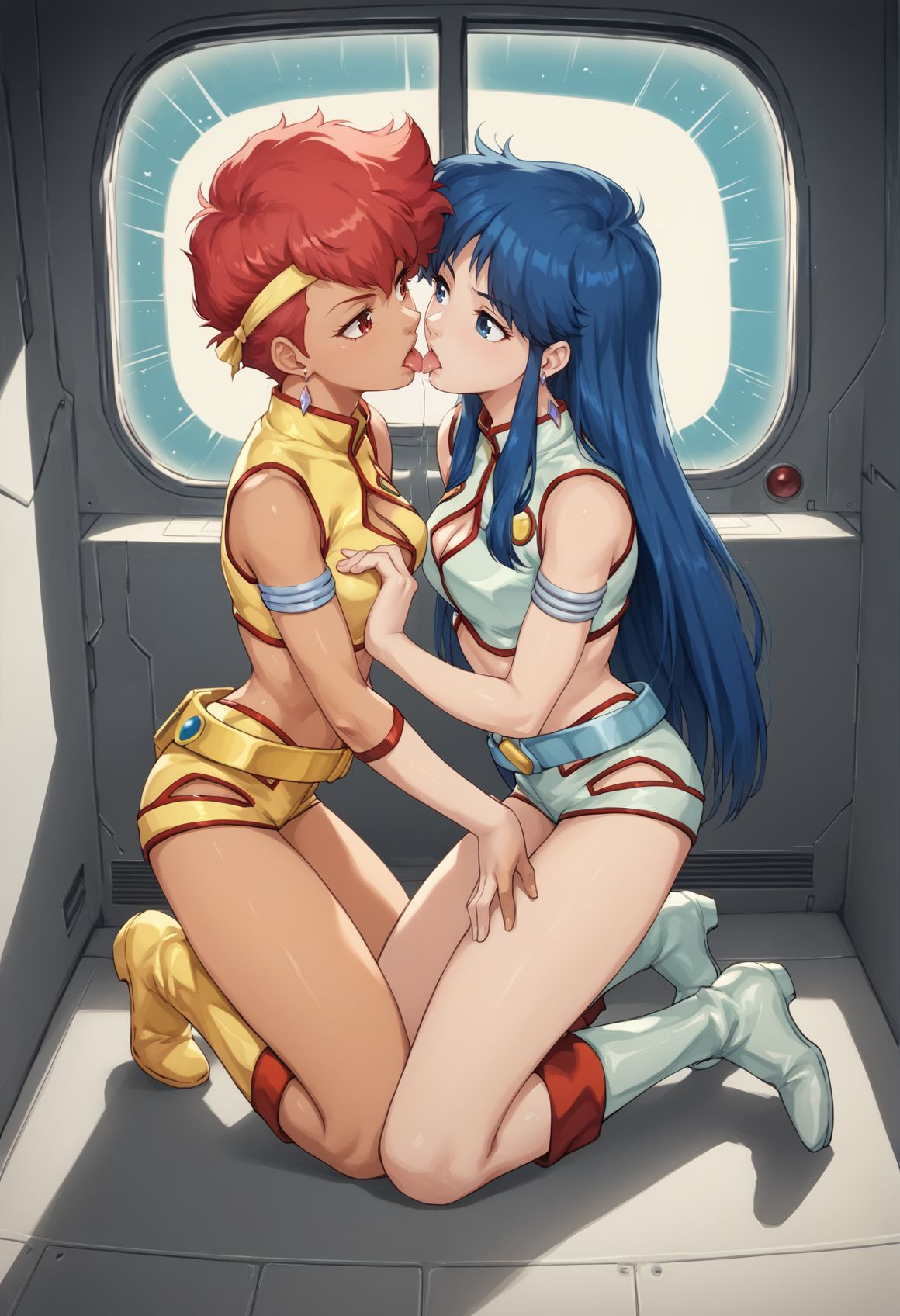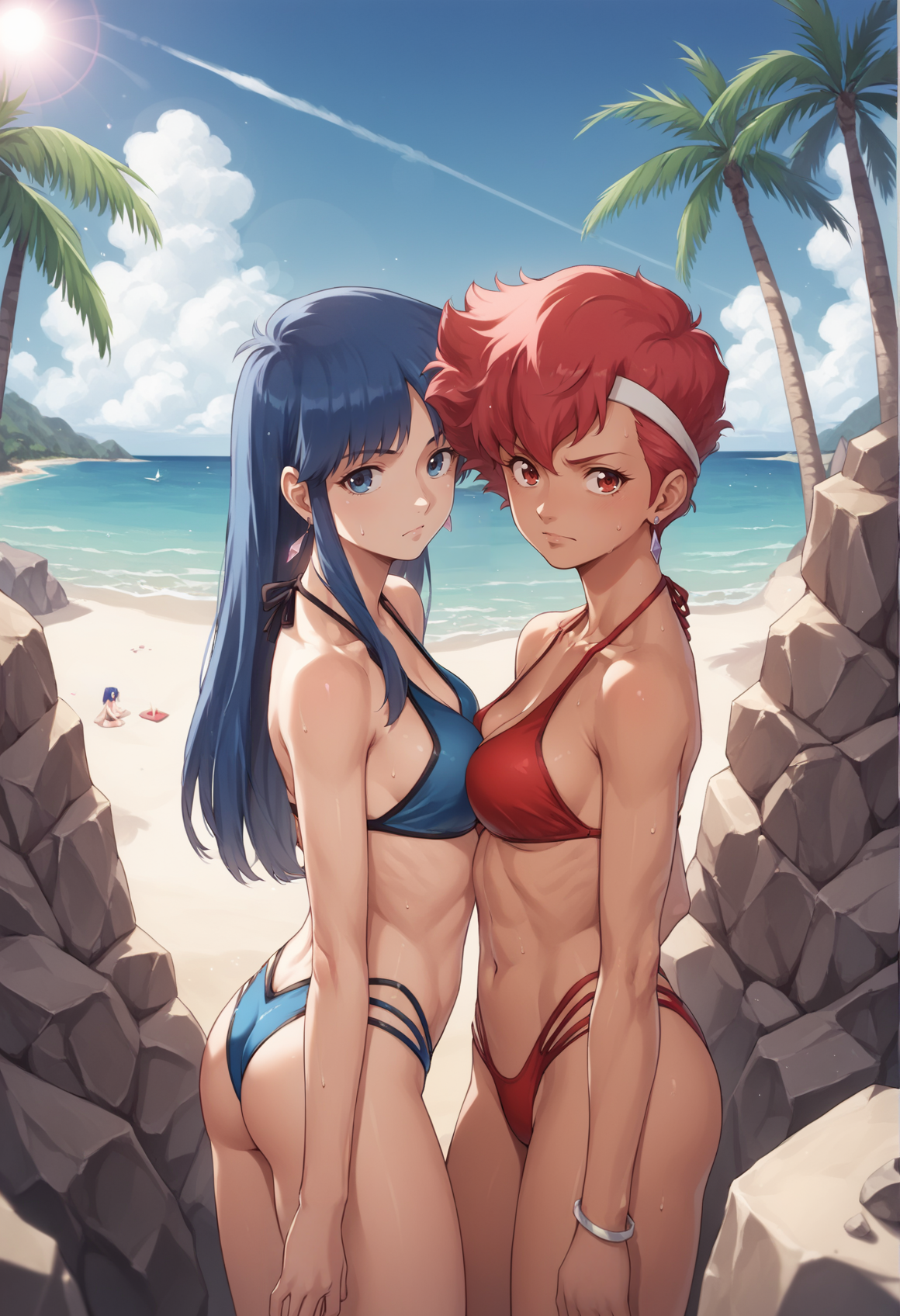 2girls, kei, 濃い肌, 短い髪, 赤い髪, 赤い目, ヘアバンド, ピアス, ジュエリー, 灰色のキャミソール, 衣服のカットアウト, 片手の手袋, 手首バンド, 上腕バンド, 灰色のショートパンツ, ベルト, 太ももブーツ, 灰色の靴, dpyuri, 淡い肌, 長い髪, 青い髪, 青い目, 黄色のキャミソール, 衣服のカットアウト, 黄色のショートパンツ, ブーツ, 黄色の靴 + context