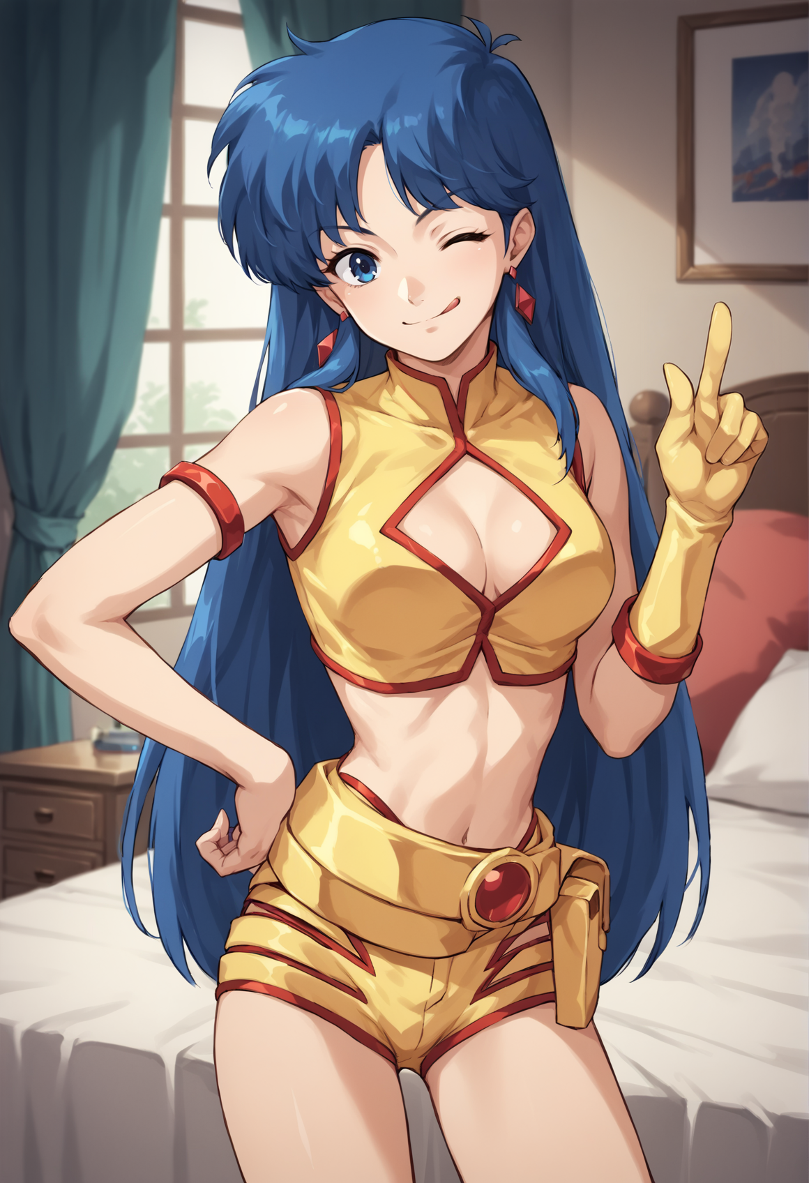 1girl, dpyuri, 淡い肌, 長い髪, 青い髪, 青い目, ピアス, ジュエリー, 黄色のキャミソール, 衣服のカットアウト, 片手の手袋, 手首バンド, 上腕バンド, 黄色のショートパンツ, ベルト, ブーツ, 黄色の靴 + context