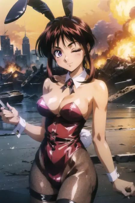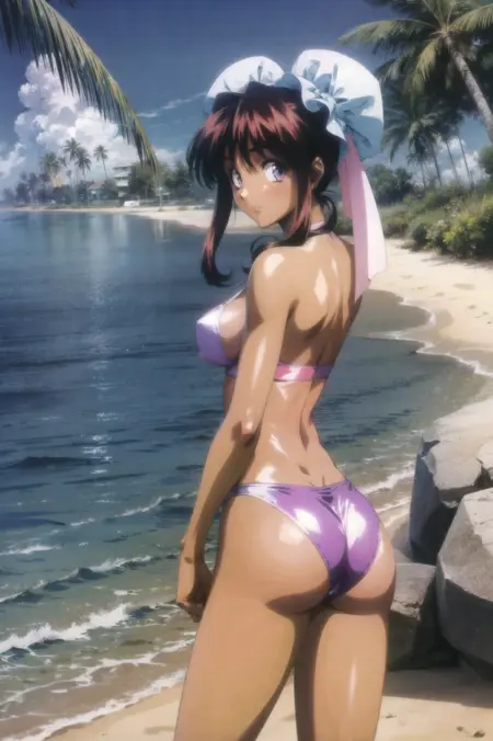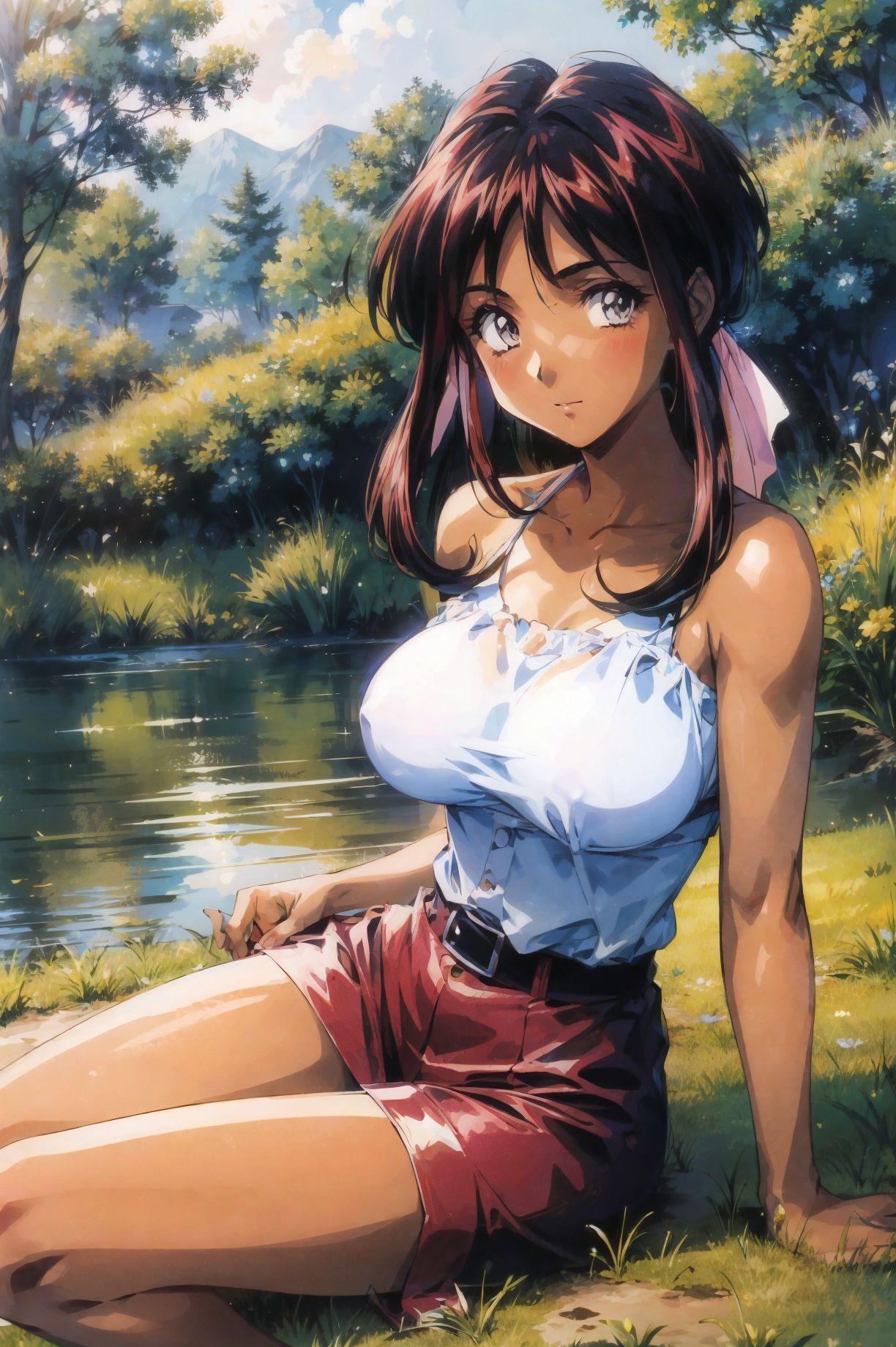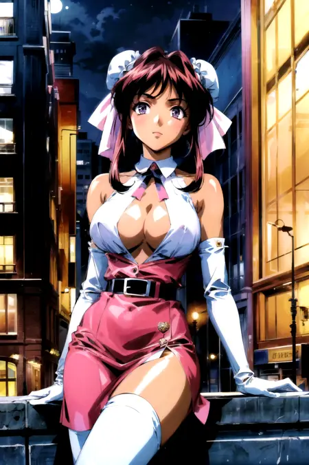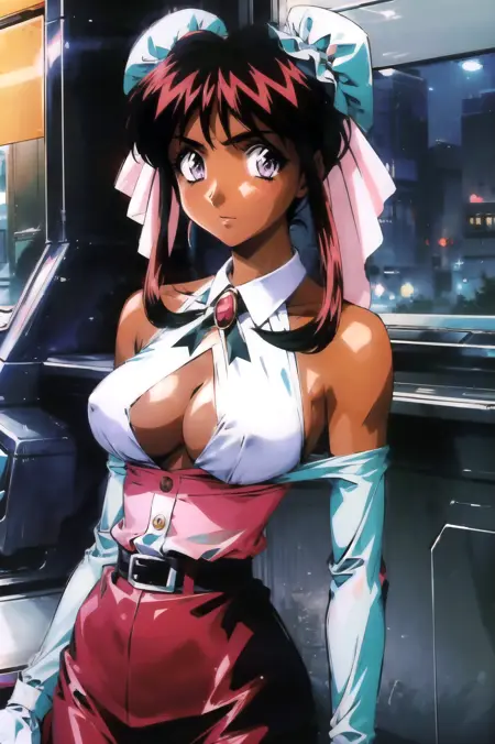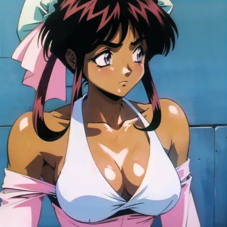 触发词:dark_skin, dark-skinned_female, retro_artstyle, 1990s_(style), purple eyes, brown hair, bun_cover, dress, neck ribbon, pink top, white shirt, elbow_gloves, bare shoulders, cleavage, collarbone, impossible clothes, breasts, tight dress
