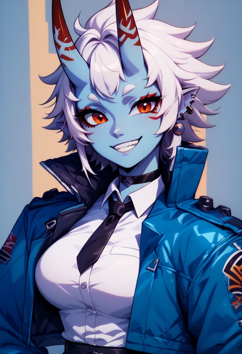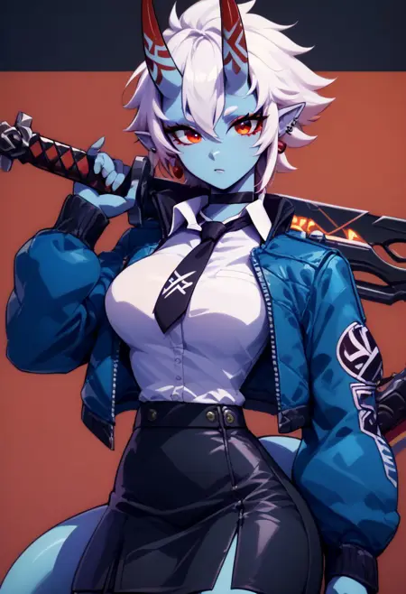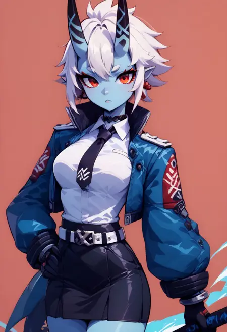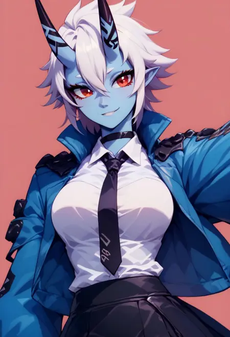 Soukaku - soukaku, red eyes, blue skin, white hair, short hair, horns, oni, black choker, jacket, white collared shirt, black tie, black skirt,
