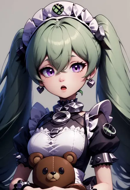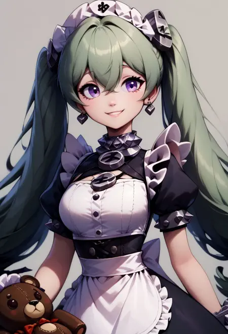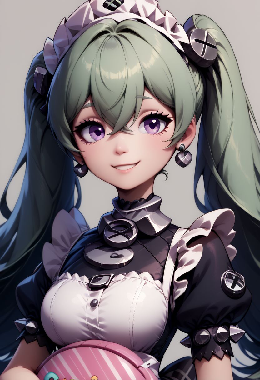 Corrin - corin wickes, 1girl, green hair, purple eyes, hair between eyes, twintails, maid headdress, puffy short sleeves, black dress, white apron,