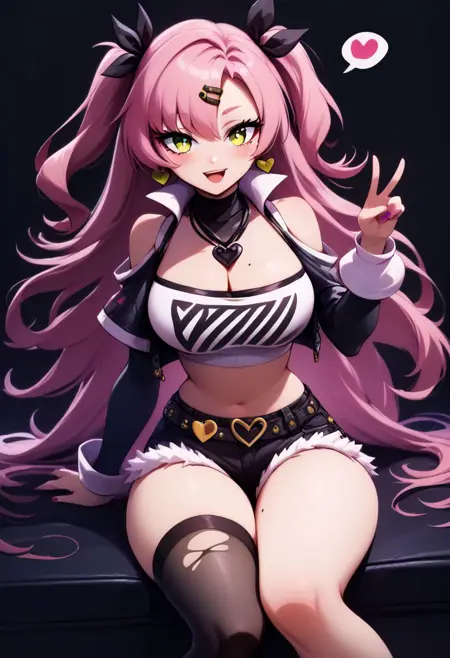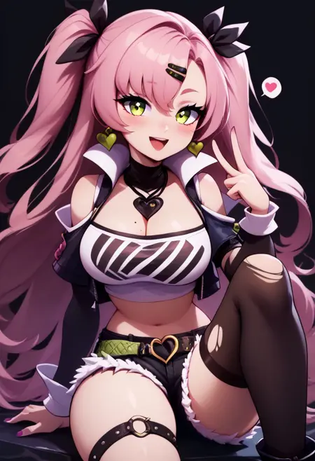 Nicole - nicole demara, green eyes, pink hair, hair ornament, hair ribbon, hairclip, long hair, mole, mole on breast, mole on thigh, mole under eye, two side up, ribbon, black footwear, black ribbon, black shorts, black socks, black thighhighs, boots, cleavage, crop top, earrings, jewelry, kneehighs, nail polish, necklace, o-ring, short shorts, shorts, single kneehigh, single sock, single thighhigh, socks, thigh strap, thighhighs, torn clothes, two side up,