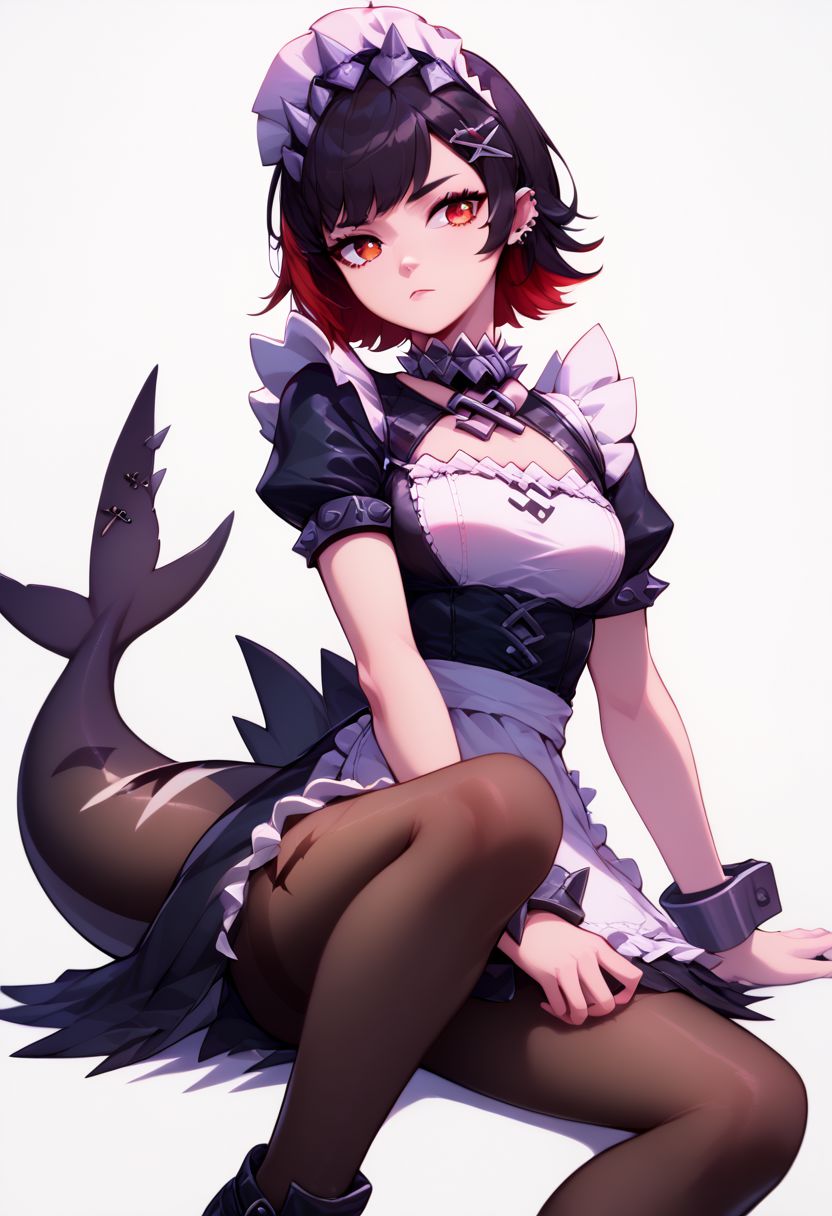 Ellen - ellen joe, black hair, colored inner hair, multicolored hair, red eyes, red hair, short hair, two-tone hair, apron, black pantyhose, black shirt, black skirt, ear piercing, fins, fish tail, maid, maid apron, maid headdress, pantyhose, piercing, puffy short sleeves, puffy sleeves, shark girl, shark tail, shirt, short sleeves, skirt, tail, two-tone hair, wrist cuffs,